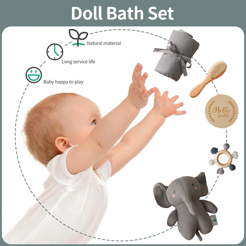 Baby Cotton Towel Wool Brush Weave Gift Box Bath Toys SetCrochet Rattle Elephant Teether Toys Silicone Rudder Teething Toys