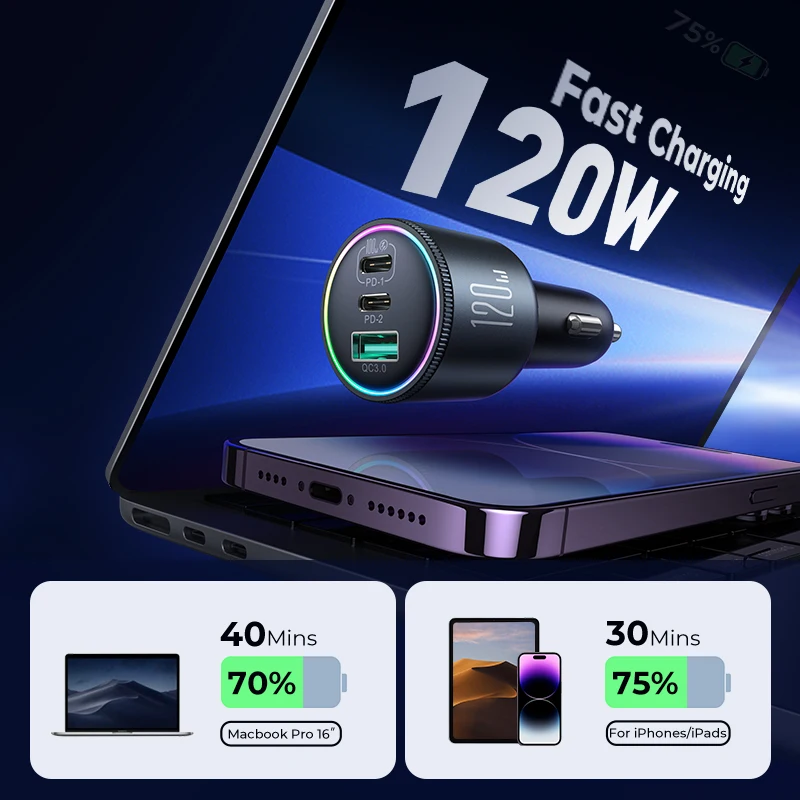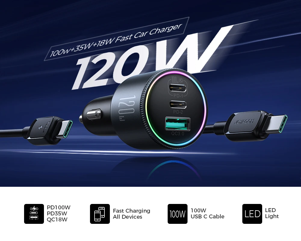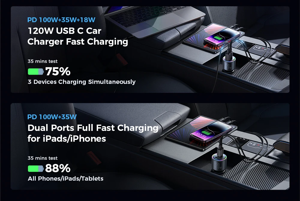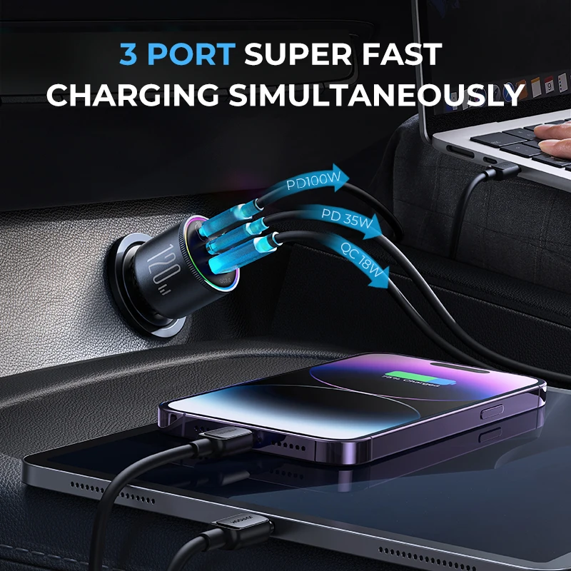 4.Fast Charging 3 Devices Simultaneously: JOYROOM 120W (Max) Super Fast Charge 3 car charger port is equipped with dual PD ports (USB-C 100w+35w) and QC 3.0 (USB A 18w) to ensure no power drop even when 3 devices are fast charging at the same time.No more waiting for charging time, enjoy multiple devices sharing a fast full charge! Best Energy Partner for Your Car Journey!