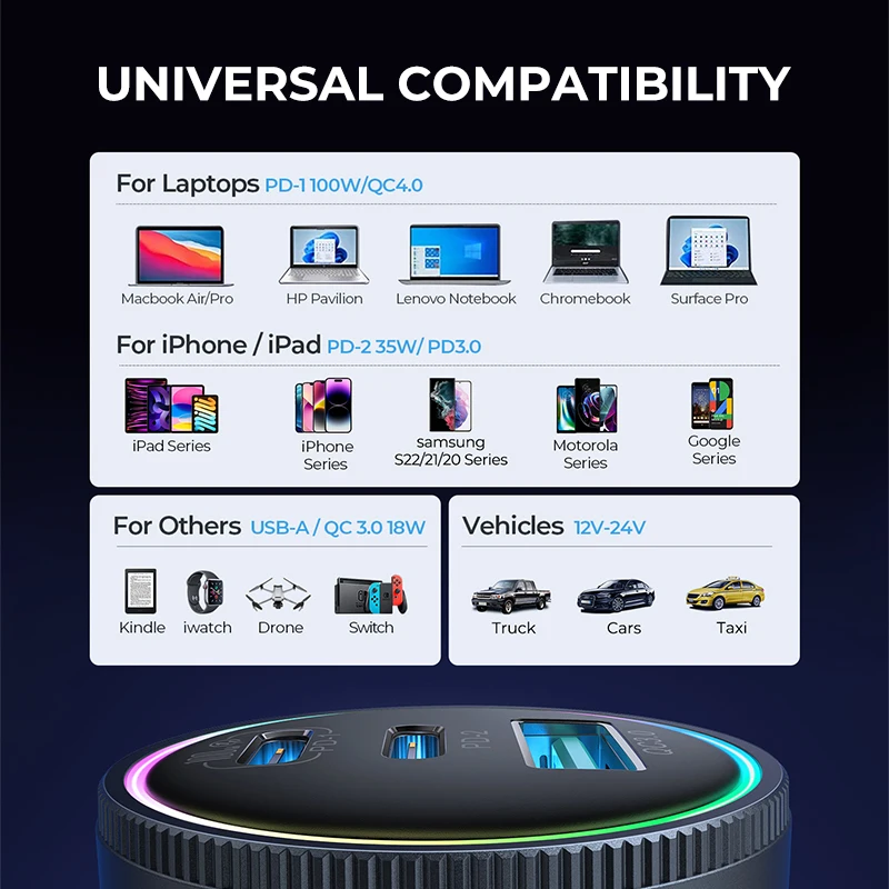7.Universal Car Charger & Wide Compatibility:JOYROOM laptop car charger automatically recognizes any corresponding device you plug in and assigns you the best charging efficiency. This usb c car charger is compatible with Macbook, iPad, iPhone 14 Pro Max/14 Pro/14 Plus/14 iPhone 13 Pro Max/iPhone 12/11/10/XR/XS, Samsung Galaxy S23 Ultra/Samsung S22/S21 Ultra/S20 Note 20/10, S9 S9, Google Pixel 6 pro/6/5, car recorders, car cameras and other USB devices. Compatible with 12-24V cars, trucks, RV.
