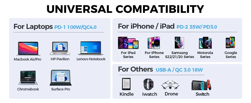 - PD-1+PD-2+QC3.0 Output: 100W+20W