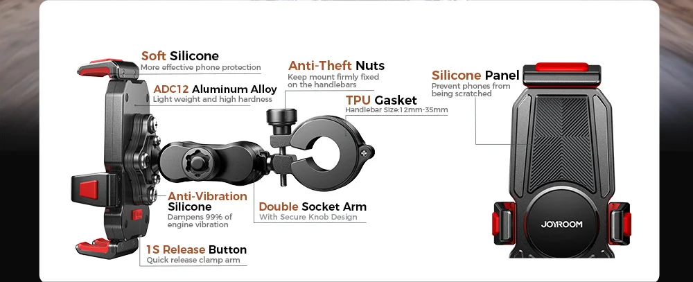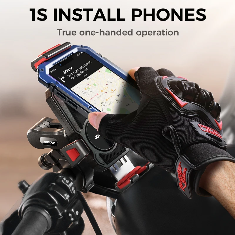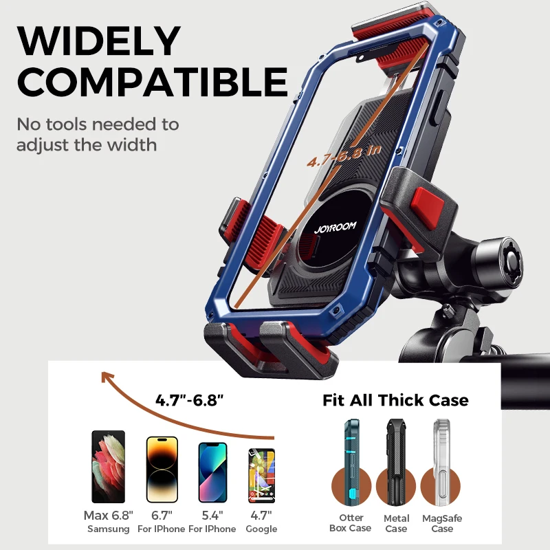 3.[ 1S Release Clamping Arm ] JOYROOM bicycle phone mount using mechanical gear clamp arm, 1s can release the clamp arm, suitable for any size of cell phone. And there is no need to use tools to adjust the width of the clamp arm.