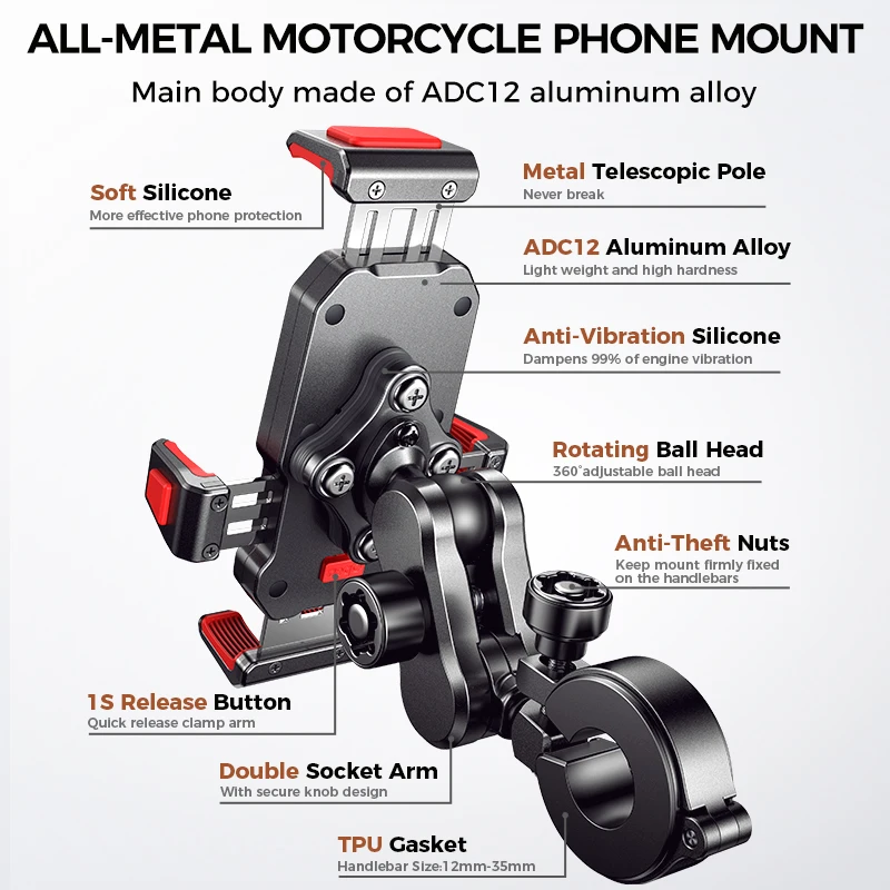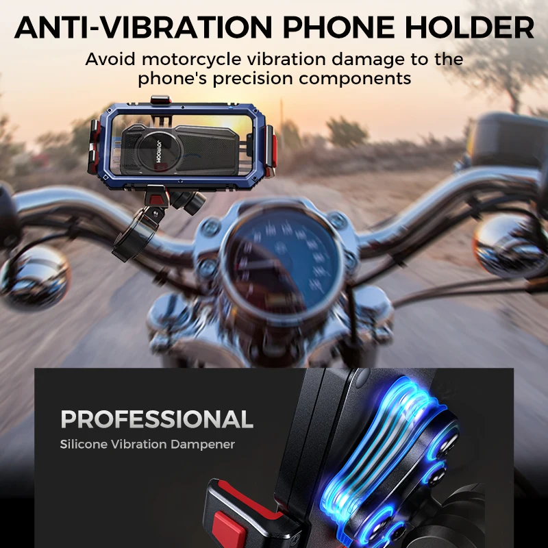 1.[ Equipped with Vibration Dampers ] This motorcycle phone mount is equipped with shock absorbers to effectively reduce the vibration generated when the engine is running at high speed, protecting the phone camera and other precision components from being harmed