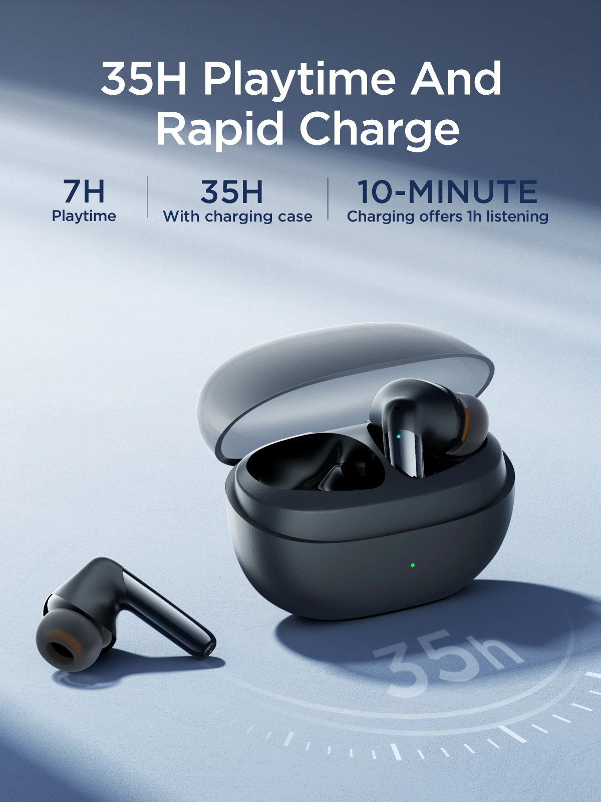 3. 35h total listening time, ultra fast charging (7h listening time on one charge, 35h total listening time with the charging case, 10-minute charging offers 1h listening)