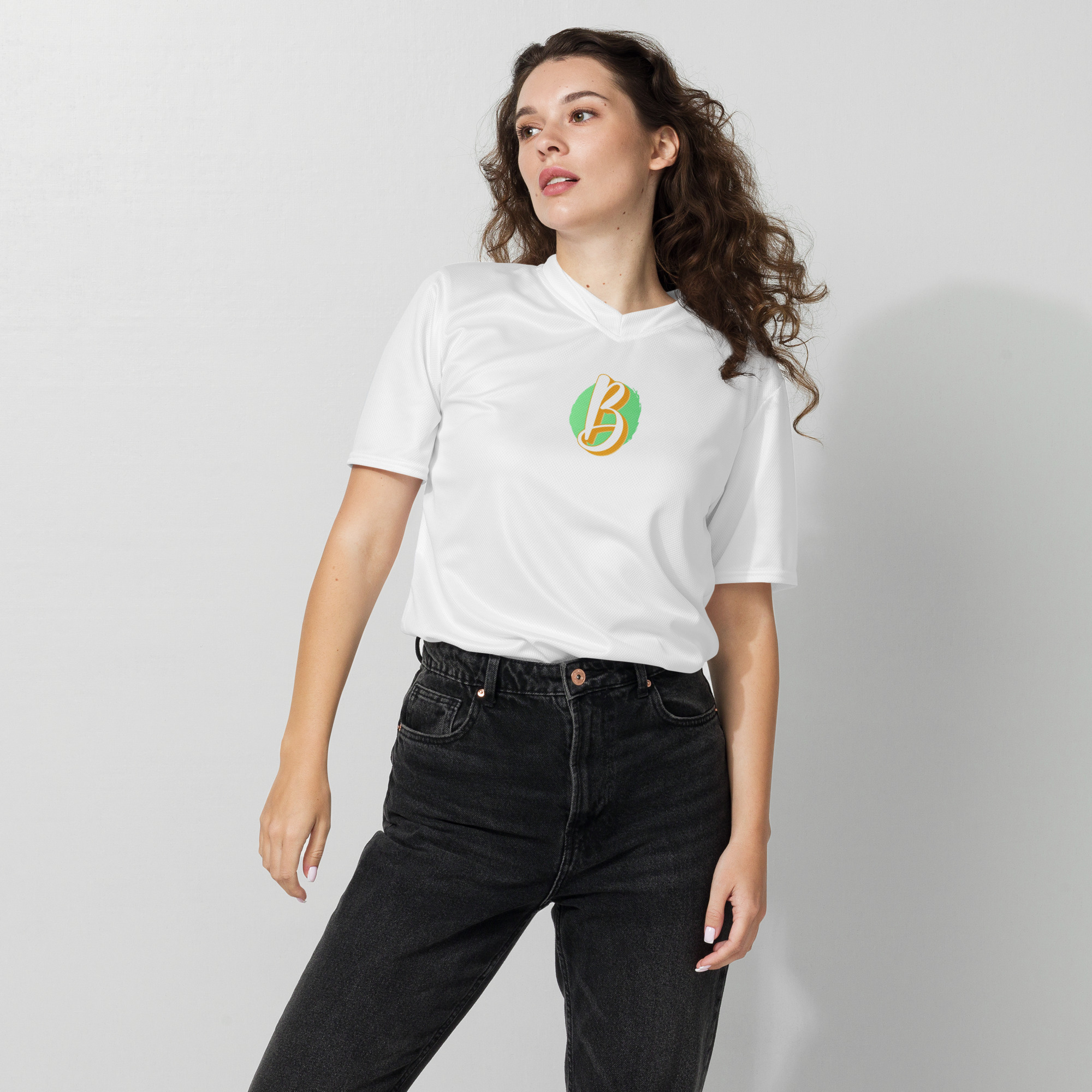 Looking for the perfect sports jersey? We have you covered—made of 100% recycled polyester fabric, this shirt is breathable, moisture-wicking, and has a double-layered v-neck collar that creates a premium look.
